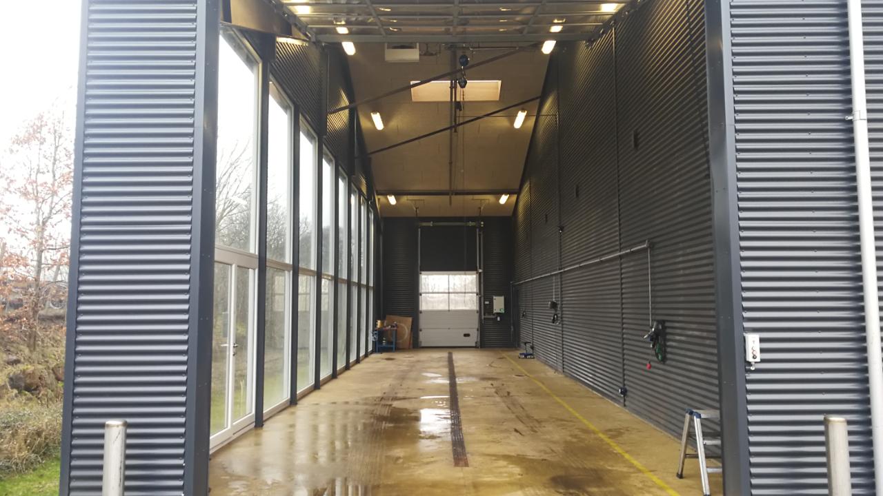 Hallen er gnistfri, eksplosionssikker og med sniffesensor, som kan åbne portene og skabe luftgennemstrømning.