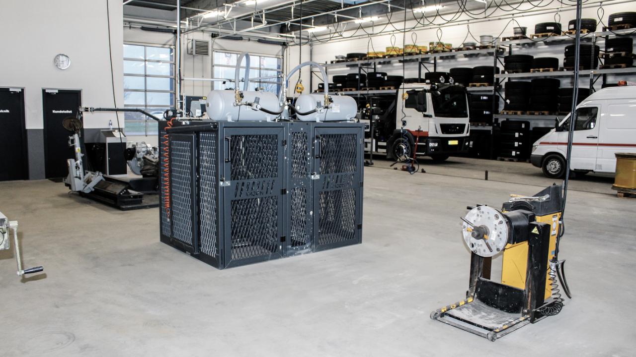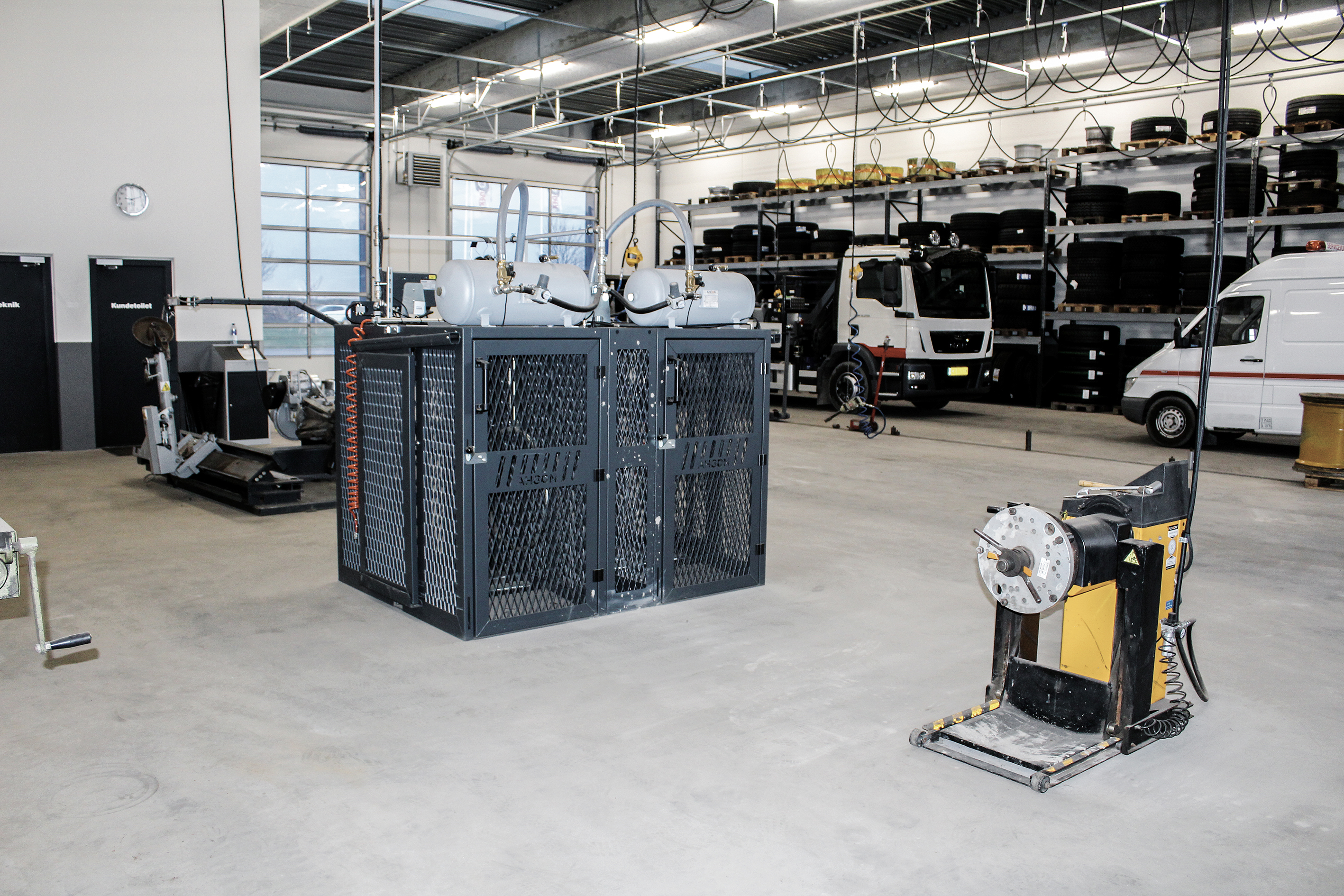 Som en del af HD værkstedet findes et dobbelt sikkerhedspumpebur fra AHCON, hvor store hjul kan pumpes både sikkert og ergonomisk.