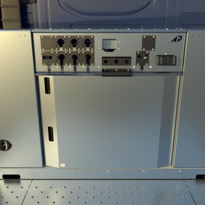 arrow_backTil oversigtenTractor Utility Rack in cabinet model with integrated boxes, hydraulic tank and trailer couplings. Tray to protect against spillage under the hydraulic couplings.