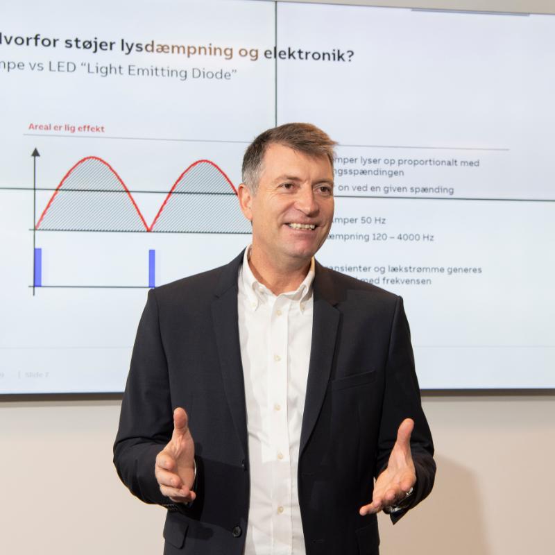 Billedtekst: Lækstrømme fra LED og anden elektronik kan forårsage utilsigtede udkoblinger. Problemet kan løses med ABB's højimmune F-ATI/F-ARI fejlstrømsafbrydere, forklarer Flemming Folkvardsen, der er salgsdirektør hos ABB.