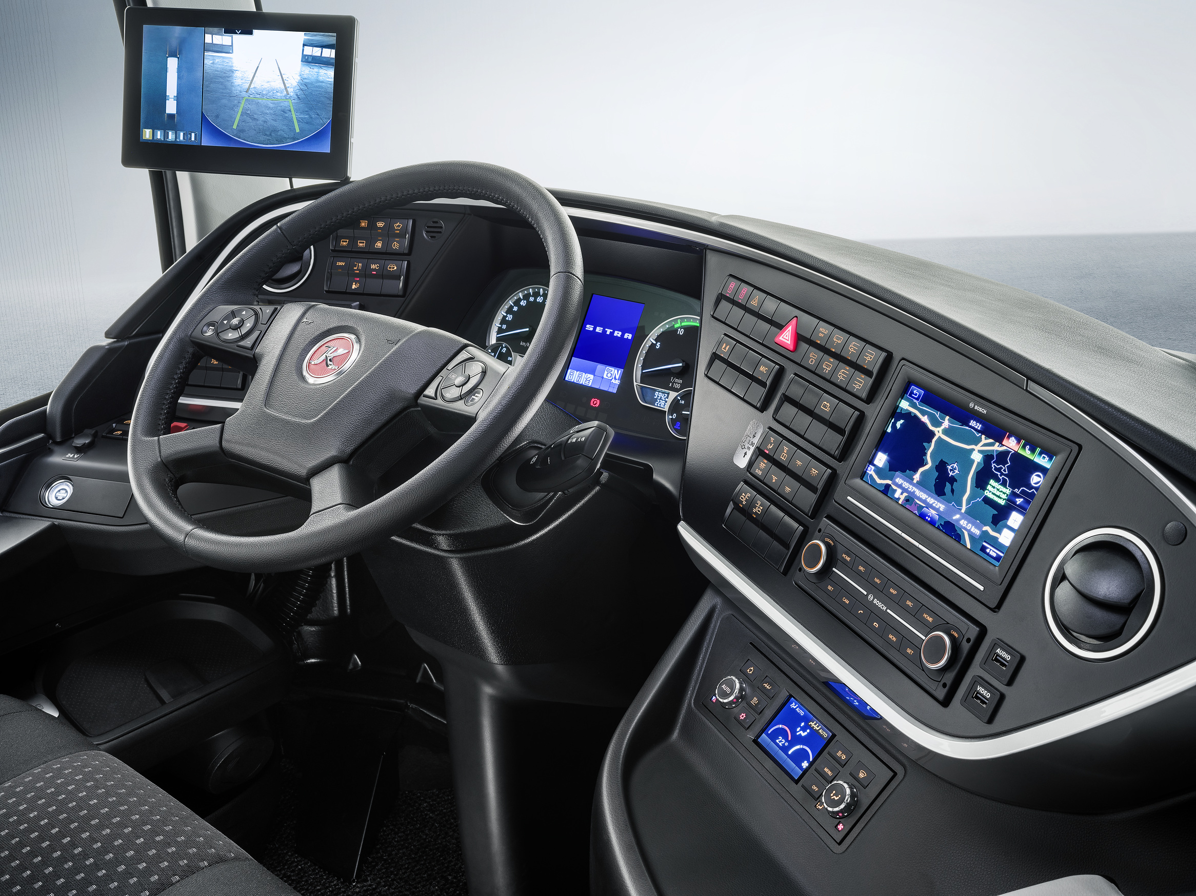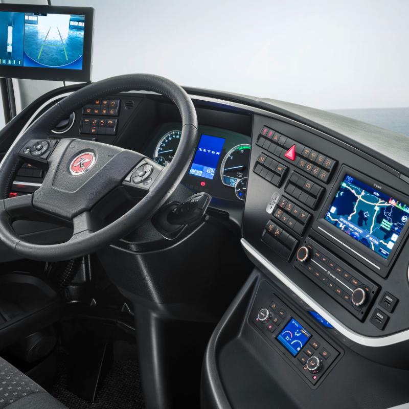 Køresikkerheden har også fået et løft. Til venstre for chaufføren ved A-stolpen er der monteret en 10-tommer touch monitor som viser bussen i 360 grader.